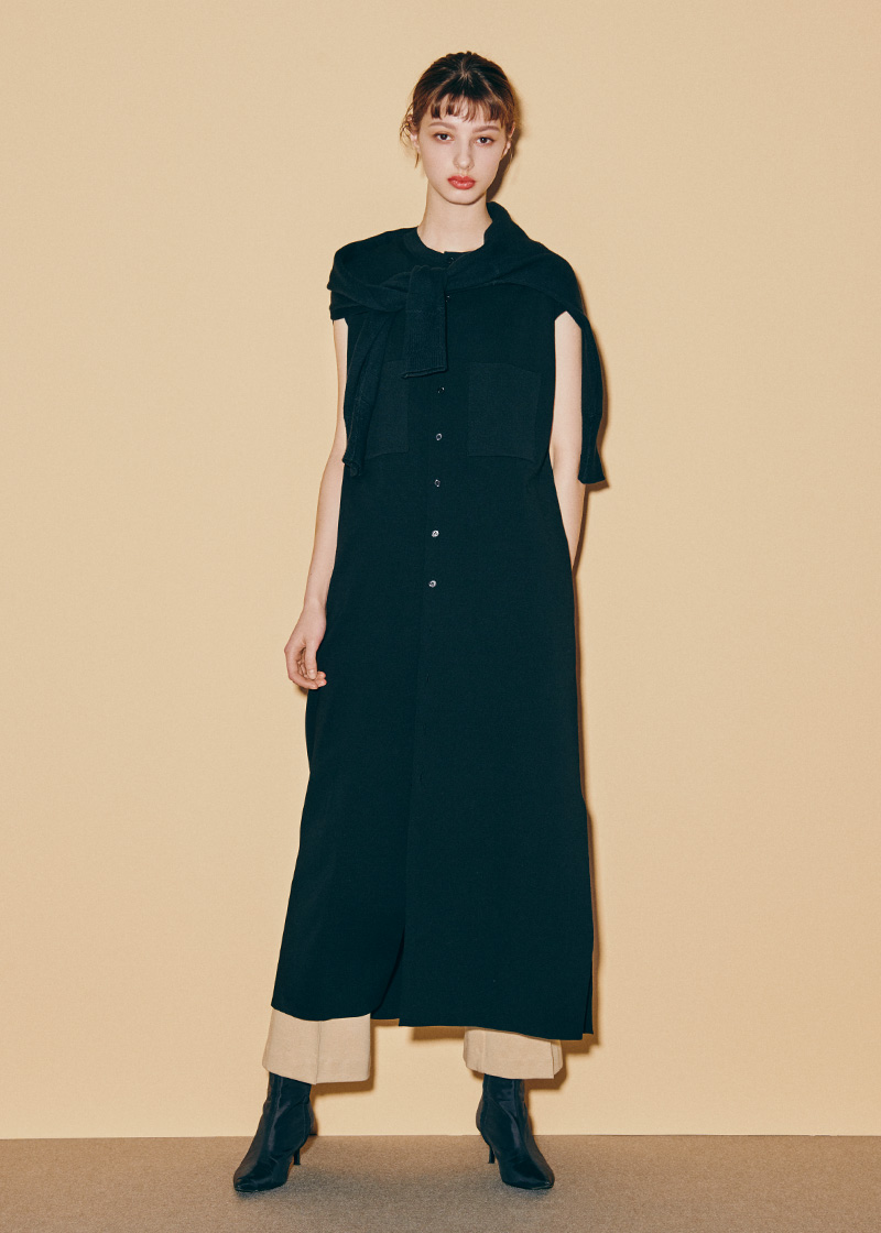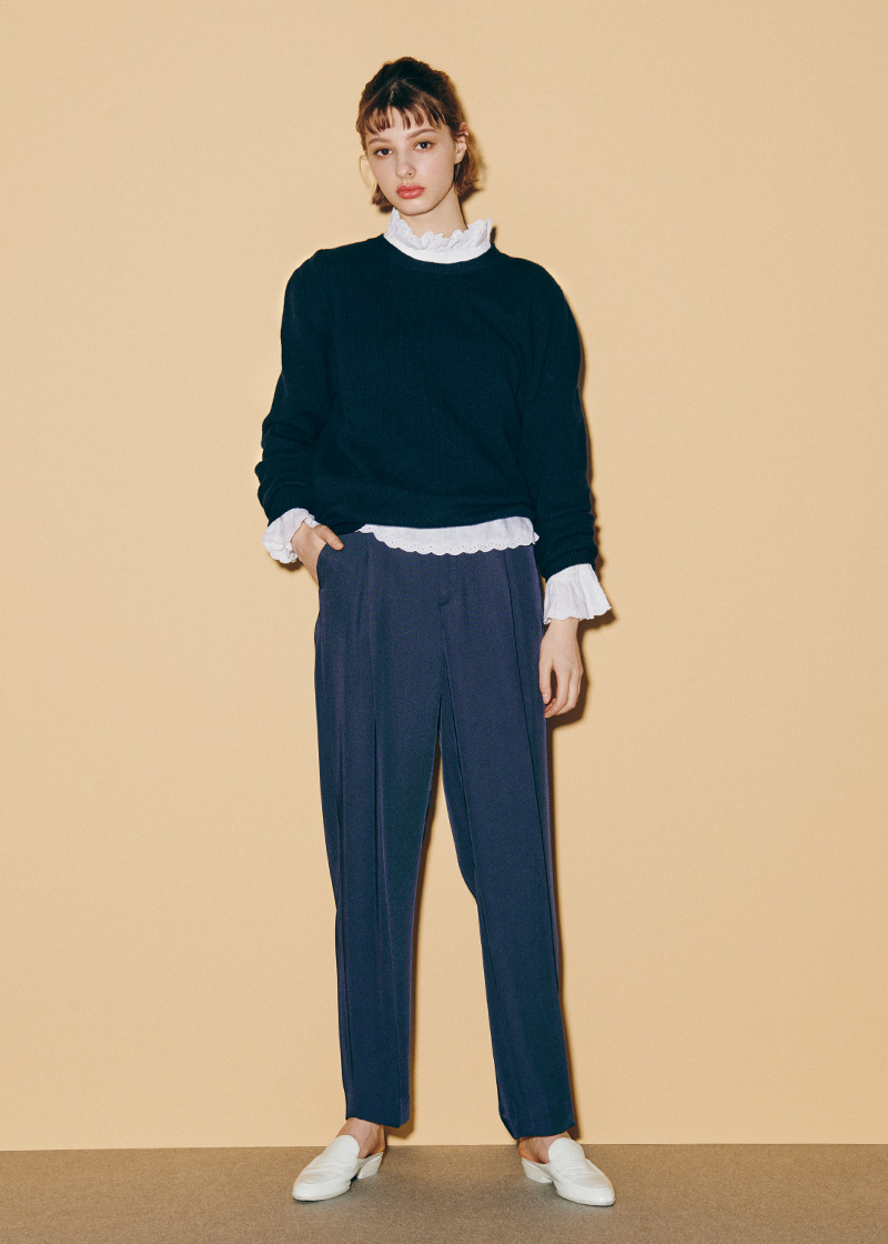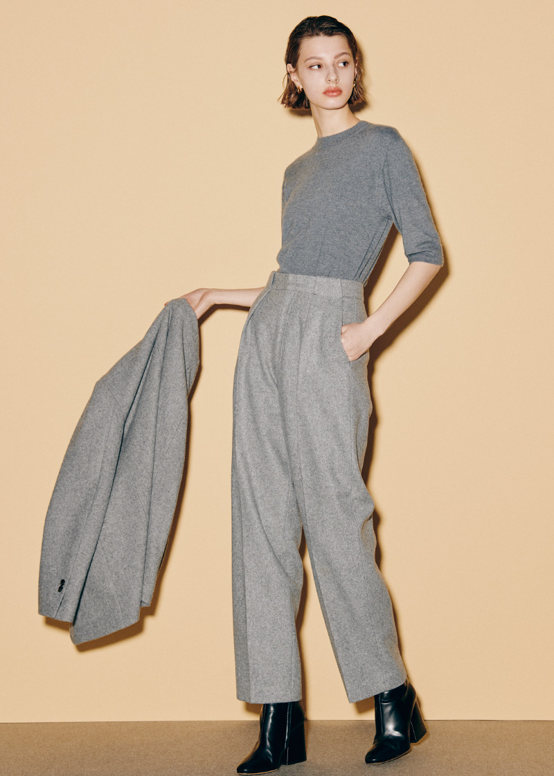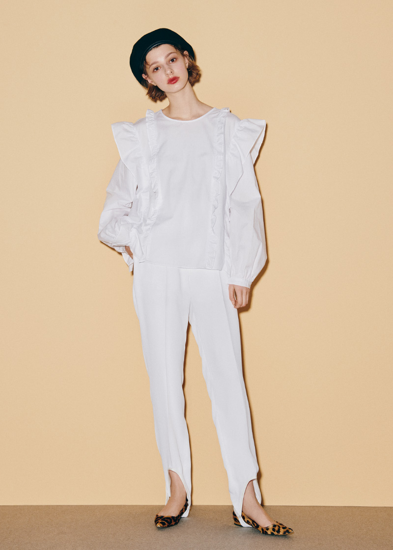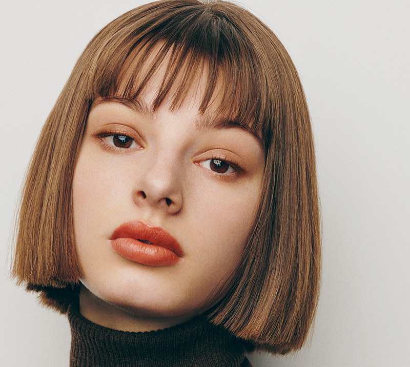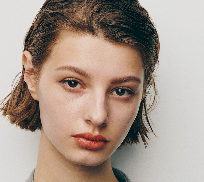 柔軟素材的上衣搭配上珊瑚色的唇膏及細長的眼線表現出女人味的氛圍
