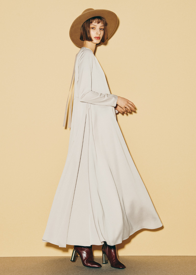 穿上全長單一色的洋裝搭配上酒紅色的唇妝及靴子呈現出高質感同色系STYLE