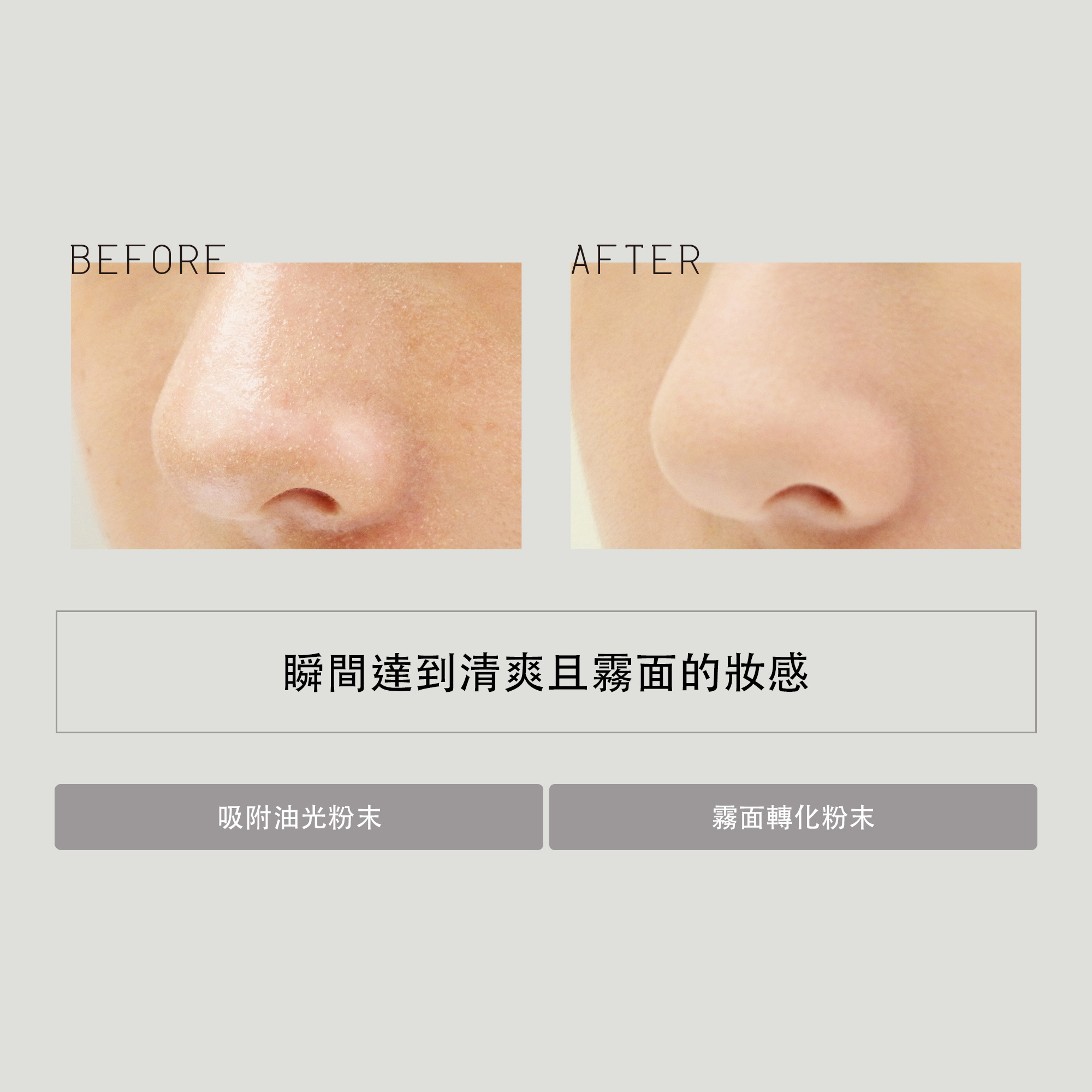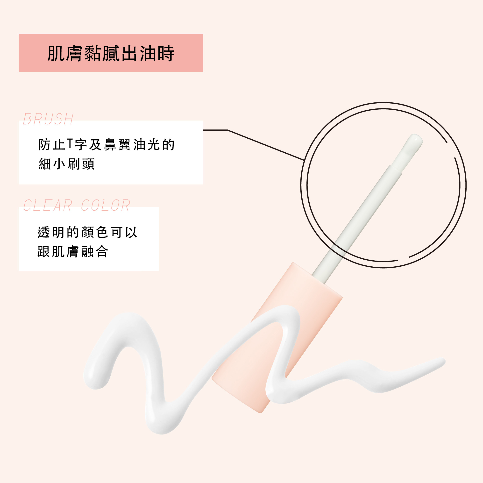 雙重控油成分可以防止油光及脫妝狀況,讓妝效清爽且服貼。一瞬間消除油光,讓肌膚變得光滑的技術。修飾油光、毛孔、防止脫妝。肌膚有油光時隨時都可以使用,可以塗抹在重點部位的細小刷頭。